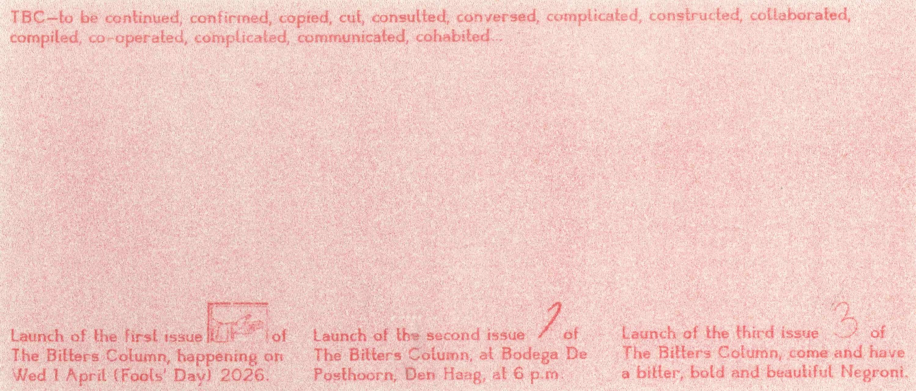The first launch was on April 1, April Fools’ Day. Bitter drinks and jokes was served at 6 p.m., Bodega De Posthoorn, Den Haag .